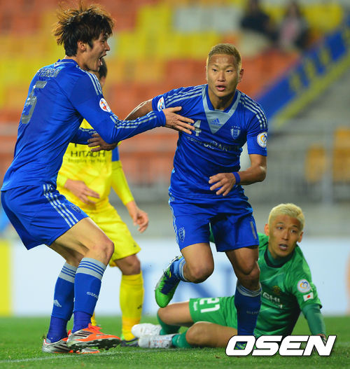 3일 오후 경기도 수원시 수원월드컵경기장에서 열린 2013 아시아축구연맹(AFC) 챔피언스리그 H조 수원 삼성과 가시와 레이솔의 경기 전반 수원 정대세가 골 성공 후 오프사이드 판정을 받고 있다