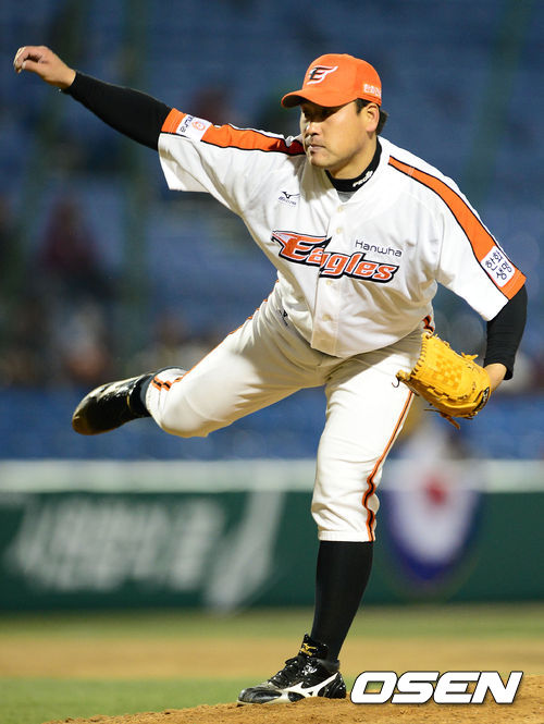 5회초 무사 한화 유창식과 교체된 김일엽이 힘차게 공을 던지고 있다.