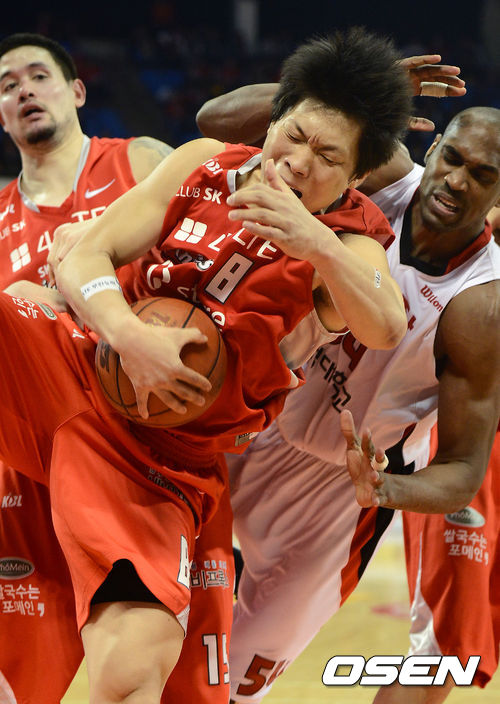 3일 오후 잠실학생체육관에서 열린 '2012-2013 KB국민카드 프로농구 4강 PO 2차전' 서울 SK와 안양 KGC의 경기 4쿼터 SK 박상오가 리바운드를 잡아내고 있다.