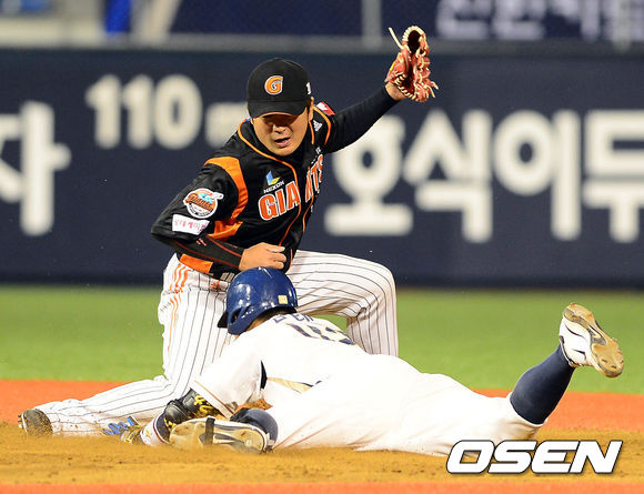 3일 오후 창원 마산구장에서 열린 '2013 한국야쿠르트 세븐 프로야구' NC 다이노스와 롯데 자이언츠의 경기 8회말 선두타자 김태군이 우중간 2루타를 치고 2루에서 슬라이딩 하고 있다.