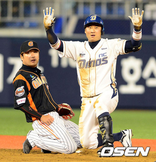 3일 오후 창원 마산구장에서 열린 '2013 한국야쿠르트 세븐 프로야구' NC 다이노스와 롯데 자이언츠의 경기 8회말 선두타자 김태군이 우중간 2루타를 치고 2루베이스에서 세이프되고 있다.