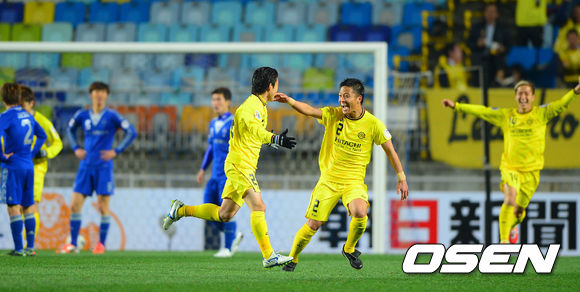 3일 오후 경기도 수원시 수원월드컵경기장에서 열린 2013 아시아축구연맹(AFC) 챔피언스리그 H조 수원 삼성과 가시와 레이솔의 경기 후반 가시와 구리사와가 추가골을 넣고 환호하고 있다