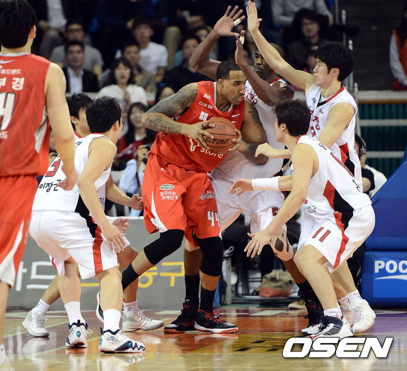 3일 오후 잠실학생체육관에서 열린 '2012-2013 KB국민카드 프로농구 4강 PO 2차전' 서울 SK와 안양 KGC의 경기 4쿼터 SK 심스가 KGC 수비에 고전하고 있다.