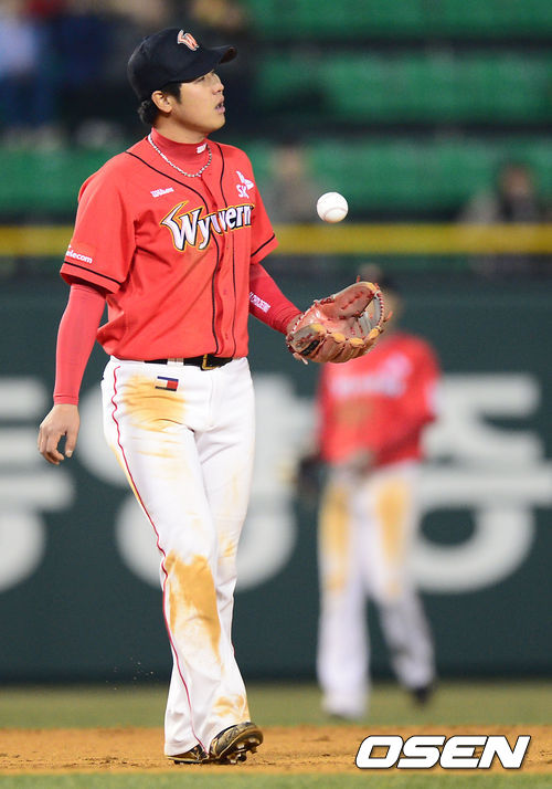 3일 오후 서울 잠실야구장에서 '2013 한국야쿠르트 세븐 프로야구' 두산 베어스 대 SK 와이번스의 경기가 열렸다. 7회말 두산 공격 1사 1루 상황 8번 양의지의 3루 땅볼 타구를 SK 3루수 최정이 실수로 놓친 뒤 아쉬워하고 있다.