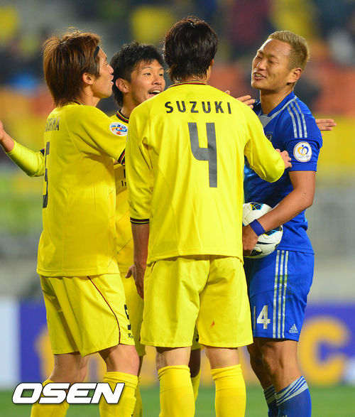 3일 오후 경기도 수원시 수원월드컵경기장에서 열린 2013 아시아축구연맹(AFC) 챔피언스리그 H조 수원 삼성과 가시와 레이솔의 경기 후반 수원 정대세가 페널티킥을 얻은 후 가시와 선수들의 항의를 듣고 있다.