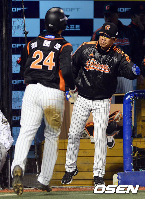 3일 오후 창원 마산구장에서 열린 '2013 한국야쿠르트 세븐 프로야구' NC 다이노스와 롯데 자이언츠의 경기 9회초 1사 1,2루 황재균의 내야땅볼 상황, 2루주자 김문호가 3루까지 쇄도 득점 후 김시진 감독과 하이파이브를 하고 있다.
