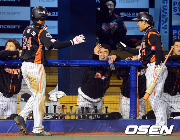 3일 오후 창원 마산구장에서 열린 '2013 한국야쿠르트 세븐 프로야구' NC 다이노스와 롯데 자이언츠의 경기 9회초 1사 1,2루 황재균의 내야땅볼 상황, 2루주자 김문호가 홈까지 쇄도 득점 후 동료들과 하이파이 하이파이브를 하고 있다.