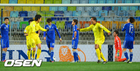3일 오후 경기도 수원시 수원월드컵경기장에서 열린 2013 아시아축구연맹(AFC) 챔피언스리그 H조 수원 삼성과 가시와 레이솔의 경기 후반 가시와에게 다섯번째 골을 허용한 수원 선수들이 허탈해하고 있다