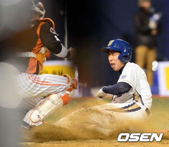 3일 오후 창원 마산구장에서 열린 '2013 한국야쿠르트 세븐 프로야구' NC 다이노스와 롯데 자이언츠의 경기 9회말 1사 3루 이현곤의 플라이아웃 상황, 홈으로 쇄도하던 박헌욱이 홈에서 아웃당하고 있다.