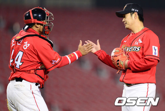 3일 오후 서울 잠실야구장에서 '2013 한국야쿠르트 세븐 프로야구' 두산 베어스 대 SK 와이번스의 경기가 열렸다. 원정팀 SK가 4-1로 홈팀 두산을 꺾고 시즌 첫 승을 거뒀다. 9회말 두산 공격 2사 만루 상황 2번 박건우를 우익수 플라이로 잡으며 경기를 마무리 지은 SK 투수 송은범과 포수 조인성이 인사를 나누고 있다.