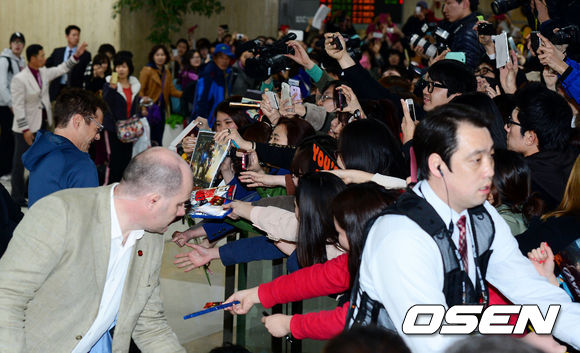 로버트 다우니 주니어가 입국장을 나서며 팬들에게 사인을 해주고 있다.