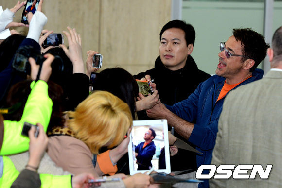 로버트 다우니 주니어가 입국장을 나서며 팬들에게 사인을 해주고 있다.