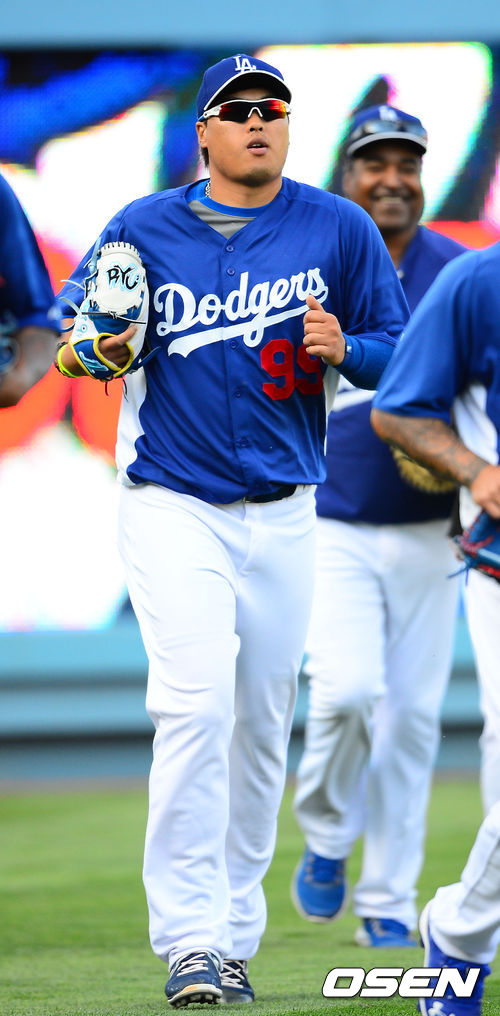 4일 오전(이상 한국시간) 미국 캘리포니아 로스앤젤레스 다저스타디움에서 LA 다저스와 샌프란시스코 자이언츠의 경기가 열릴 예정인 가운데 훈련 시간에 LA 다저스 류현진이 훈련을 마치고 뛰어오고 있다.