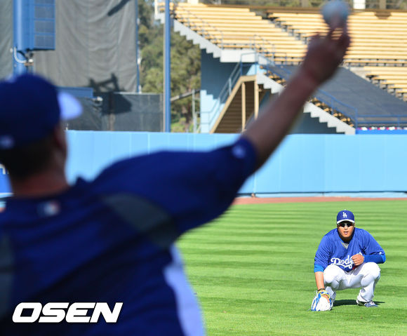 4일 오전(이상 한국시간) 미국 캘리포니아 로스앤젤레스 다저스타디움에서 LA 다저스와 샌프란시스코 자이언츠의 경기가 열릴 예정인 가운데 훈련 시간에 LA 다저스 류현진이 캐치볼을 하고 있다.