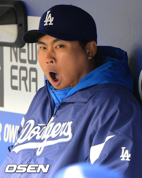 4일 오전(이상 한국시간) 미국 캘리포니아 로스앤젤레스 다저스타디움에서 LA 다저스와 샌프란시스코 자이언츠의 경기가 열렸다. 덕아웃에서 류현진이 하품을 하고 있다.