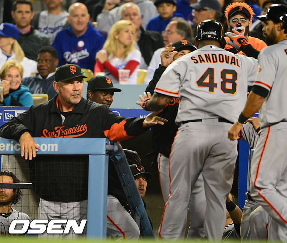 샌프란시스코 3회초 2사 주자 1루 샌프란시스코 파블로 산도발이 덕아웃에서 부르스 보치 감독과 하이파이브를 하고 있다.