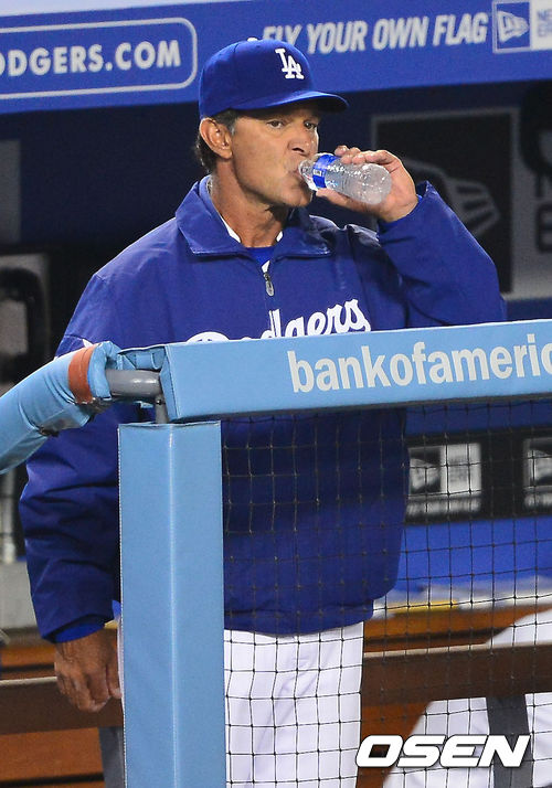 경기를 지켜보던 돈 매팅리 감독이 덕아웃에서 물을 마시고 있다.