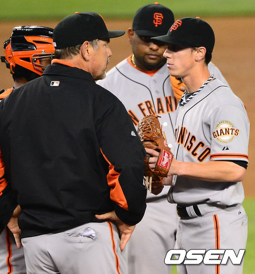 5회말 2사 자이언츠 팀 린스컴이 실점과 볼넷으로 흔들리자 브루스 보치 감독이 마운드에 올라 얘기를 나누고 있다.