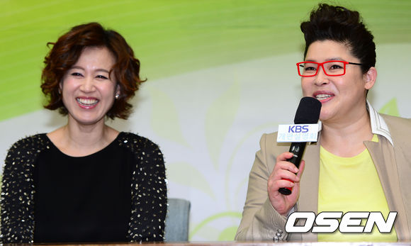 방송인 박미선과 이영자가 4일 오후 서울 여의도 KBS 신관 국제회의장에서 열린 '2013 KBS 봄 개편 설명회'에 참석해 인사말을 하고 있다.