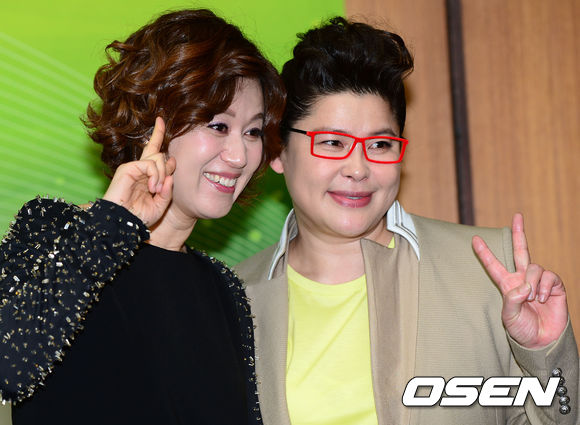 방송인 박미선과 이영자가 4일 오후 서울 여의도 KBS 신관 국제회의장에서 열린 '2013 KBS 봄 개편 설명회'에 참석해 포토타임을 마치고 취재진을 향해 포즈를 취하고 있다.
