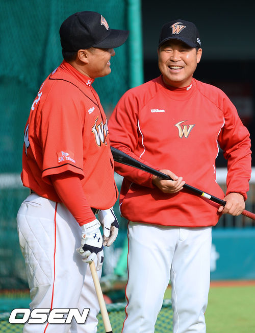 4일 오후 서울 잠실구장에서 열리는 2013 한국야쿠르트 세븐 프로야구 두산 베어스와 SK 와이번스의 경기, 경기에 앞서 SK 이만수 감독이 조인성에게 전날 타격에 대한 코치를 하고 있다