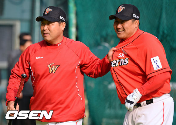 4일 오후 서울 잠실구장에서 열리는 2013 한국야쿠르트 세븐 프로야구 두산 베어스와 SK 와이번스의 경기, 경기에 앞서 SK 이만수 감독이 조인성에게 전날 타격에 대한 코치를 하고 있다