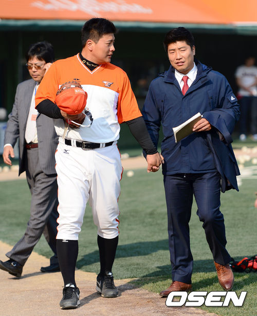 4일 오후 대전 한밭종합운동장 야구장에서 열린 2013 한국야쿠르트 세븐프로야구 한화 이글스와 KIA 타이거즈의 경기, 경기에 앞서 한화 김태균과 박재홍 MBC스포츠플러스 해설위원이 이야기를 나누고 있다.
