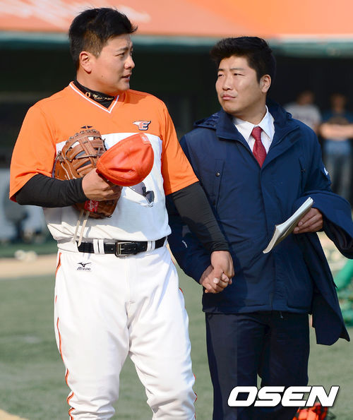 4일 오후 대전 한밭종합운동장 야구장에서 열린 2013 한국야쿠르트 세븐프로야구 한화 이글스와 KIA 타이거즈의 경기, 경기에 앞서 한화 김태균과 박재홍 MBC스포츠플러스 해설위원이 이야기를 나누고 있다.