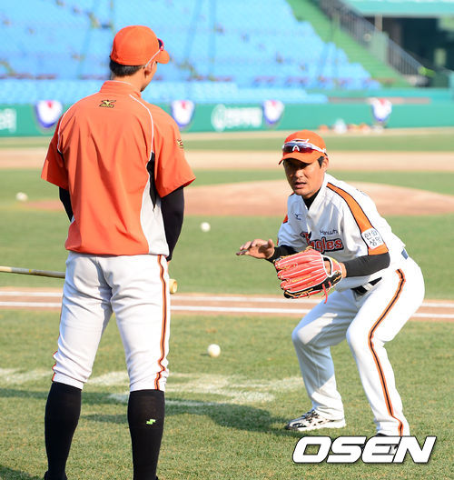 4일 오후 대전 한밭종합운동장 야구장에서 열린 2013 한국야쿠르트 세븐프로야구 한화 이글스와 KIA 타이거즈의 경기, 경기에 앞서 한화 이종범 코치가 하주석을 지도하고 있다.