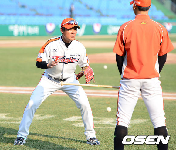 4일 오후 대전 한밭종합운동장 야구장에서 열린 2013 한국야쿠르트 세븐프로야구 한화 이글스와 KIA 타이거즈의 경기, 경기에 앞서 한화 이종범 코치가 하주석을 지도하고 있다.
