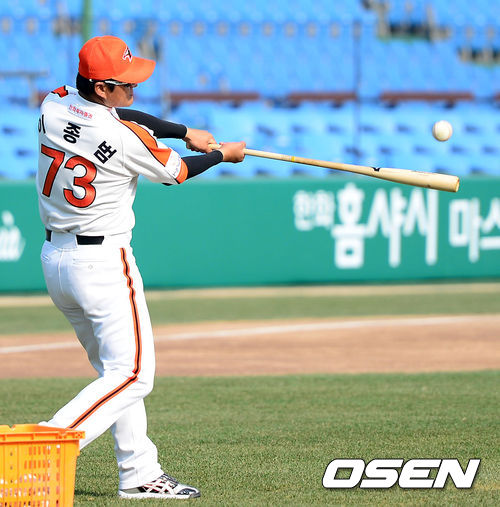 4일 오후 대전 한밭종합운동장 야구장에서 열린 2013 한국야쿠르트 세븐프로야구 한화 이글스와 KIA 타이거즈의 경기, 경기에 앞서 한화 이종범 코치가 펑코를 치고 있다.