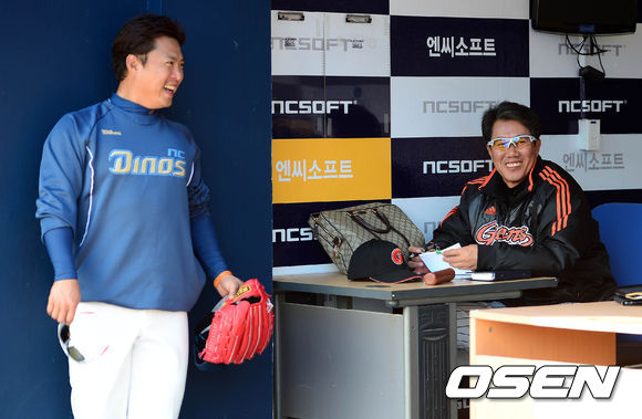 4일 오후 창원 마산구장에서 열리는 '2013 한국야쿠르트 세븐 프로야구' NC 다이노스와 롯데 자이언츠의 경기 시작 전 김시진 감독과 송신영이 이야기를 나누고 있다.