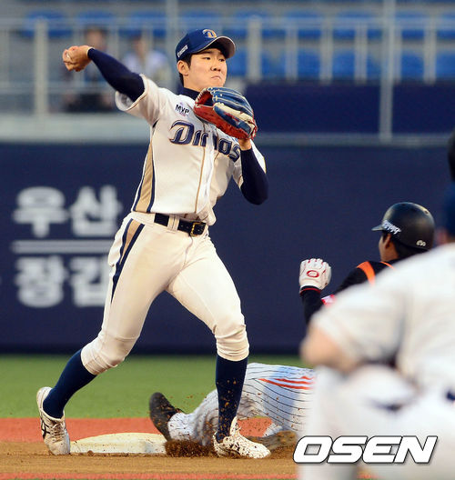 4일 오후 창원 마산구장에서 열린 '2013 한국야쿠르트 세븐 프로야구' NC 다이노스와 롯데 자이언츠의 경기 1회초 무사 1루 박준서의 내야땅볼 상황, 박민우가 2루에서 1루주자 김문호를 포스아웃 시키고 1루로 송구하고 있다.