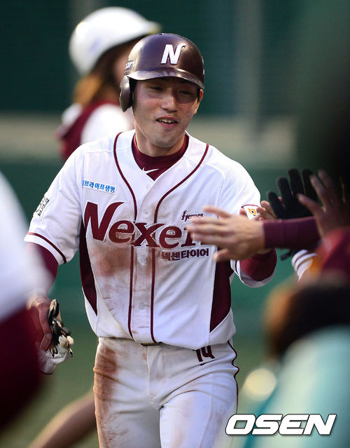 1회말 2사 3루에서 넥센 서건창이 박병호의 내야땅볼에 홈을 밟고 동료선수들과 하이파이브를 하고 있다.