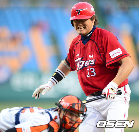 4일 오후 대전 한밭종합운동장 야구장에서 열린 2013 한국야쿠르트 세븐프로야구 한화 이글스와 KIA 타이거즈의 경기, 1회초 1사 만루에서 한화 바티스타의 투구에 맞은 KIA 최희섭이 고통스러운 표정을 짓고 있다.