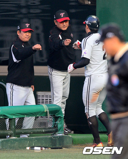 1회초 1사 1,3루에서 LG 오지환이 정성훈의 내야땅볼에 홈을 밟고 김기태 감독과 하이파이브를 하고 있다.