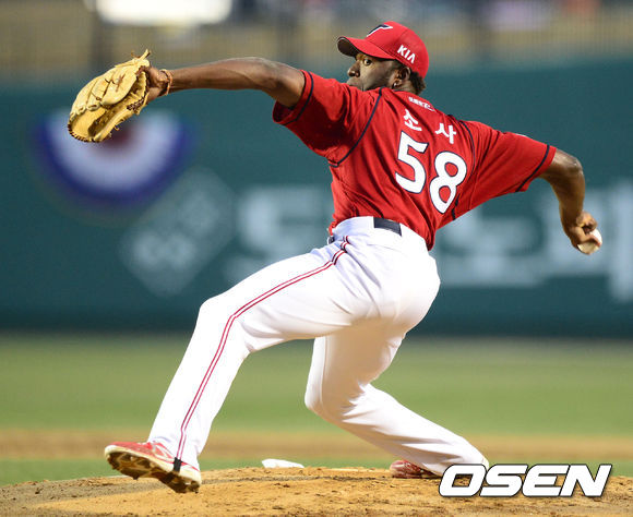 4일 오후 대전 한밭종합운동장 야구장에서 열린 2013 한국야쿠르트 세븐프로야구 한화 이글스와 KIA 타이거즈의 경기, 1회말 KIA 선발 투수 소사가 힘차게 공을 던지고 있다.