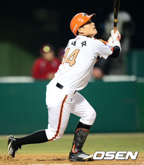4일 오후 대전 한밭종합운동장 야구장에서 열린 2013 한국야쿠르트 세븐프로야구 한화 이글스와 KIA 타이거즈의 경기, 2회말 2사 2,3루에서 한화 이대수가 희생플라이를 날리고 있다.