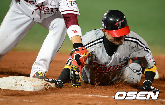 4회초 무사 1루에서 LG 정성훈이 넥센 허도환의 견제에 박병호의 태그에 앞서 가까스로 세이프되고 있다.