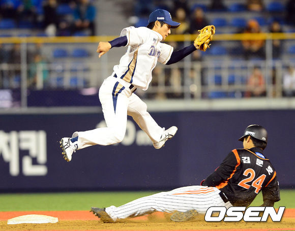 4일 오후 창원 마산구장에서 열린 '2013 한국야쿠르트 세븐 프로야구' NC 다이노스와 롯데 자이언츠의 경기 5회초 1사 1루 박준서의 타석, 1루주자 김문호가 도루에 성공하고 있다.
