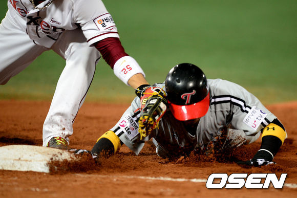 4회초 무사 1루에서 LG 정성훈이 넥센 허도환의 견제에 박병호의 태그에 앞서 가까스로 세이프되고있다.
