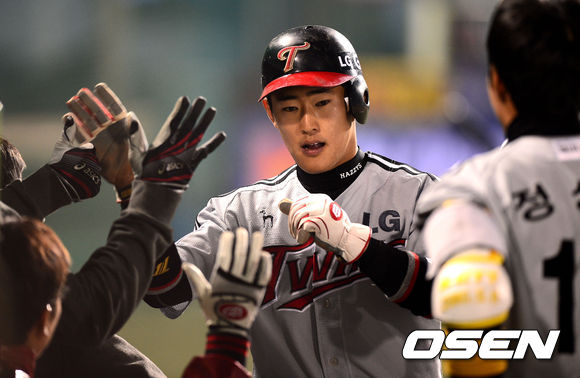 5회초 1사 2루에서 LG 오지환의 1타점 우전 적시타에 2루 주자 정주현이 홈을 밟고 동료선수들과 하이파이브를 하고 있다.
