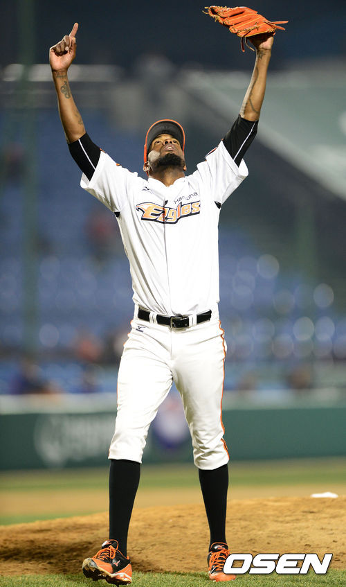 4일 오후 대전 한밭종합운동장 야구장에서 열린 2013 한국야쿠르트 세븐프로야구 한화 이글스와 KIA 타이거즈의 경기, 6회초 2사 1루에서 KIA 차일목을 삼진으로 처리한 한화 바티스타가 환호하고 있다.