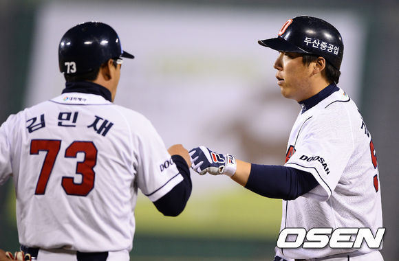 4일 오후 서울 잠실구장에서 열린 2013 한국야쿠르트 세븐 프로야구 두산 베어스와 SK 와이번스의 경기,6회말 1사 2,3루 두산 김현수가 역전 1타점 적시타를 날리고 김민재 코치와 하이파이브를 하고 있다