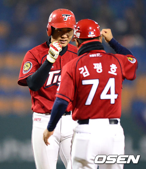 4일 오후 대전 한밭종합운동장 야구장에서 열린 2013 한국야쿠르트 세븐프로야구 한화 이글스와 KIA 타이거즈의 경기, 7회초 1사 2루에서 KIA 신종길이 우전 적시타를 치고 김평호 코치와 하이파이브를 하고 있다.