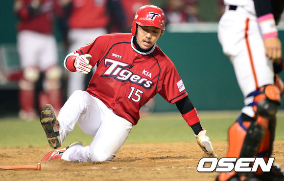 4일 오후 대전 한밭종합운동장 야구장에서 열린 2013 한국야쿠르트 세븐프로야구 한화 이글스와 KIA 타이거즈의 경기, 7회초 1사 2루에서 KIA 신종길의 우전 적시타 때 2루주자 이용규가 홈으로 쇄도해 세이프 되고 있다.