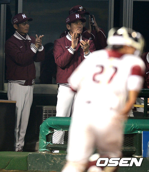7회초 1사 3루에서 LG 정주현이 이천웅의 좌익수 플라이에 홈에서 넥센 허도환에 태그아웃당하자 염경엽 감독과 이강철 코치가 박수를 치며 격려하고 있다.
