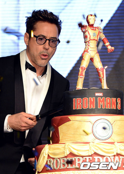 4일 오후 서울 영등포 타임스퀘어에서 진행된 영화 '아이언맨3' 레드카펫 행사에서 로버트 다우니 주니어가 케익 커팅을 하고 있다.