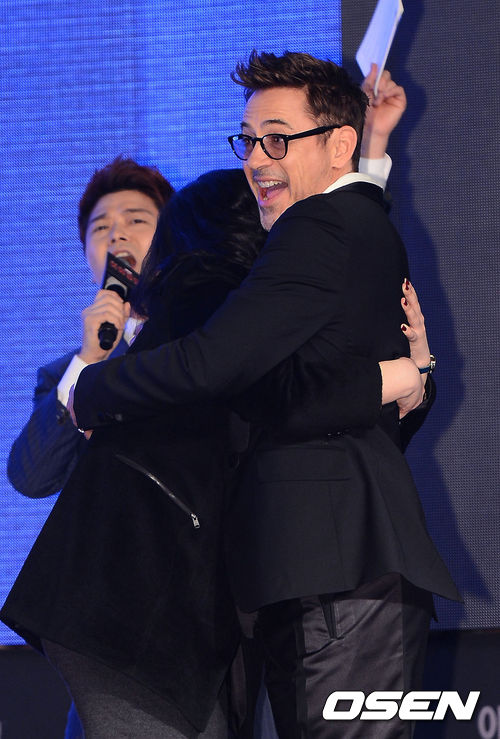 4일 오후 서울 영등포 타임스퀘어에서 진행된 영화 '아이언맨3' 레드카펫 행사에서 로버트 다우니 주니어가 여성팬과 포옹을 하고 있다.