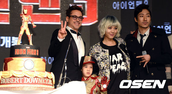 4일 오후 서울 영등포 타임스퀘어에서 진행된 영화 '아이언맨3' 레드카펫 행사에서 로버트 다우니 주니어가 타이거 JK, 윤미래 부부, 조단과 포토타임을 갖고 있다.